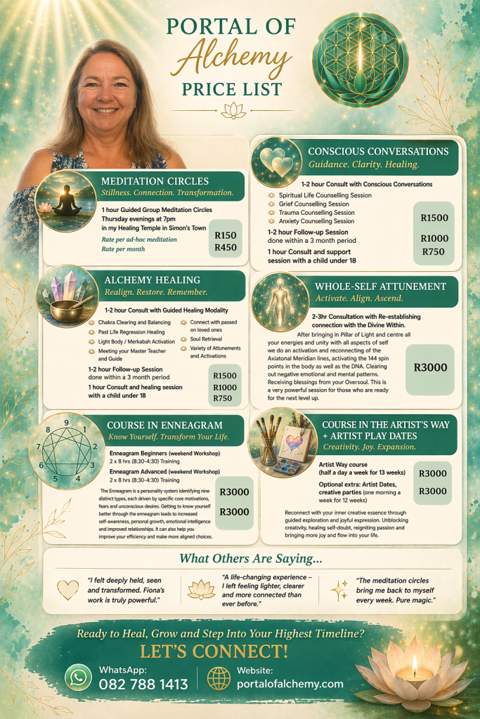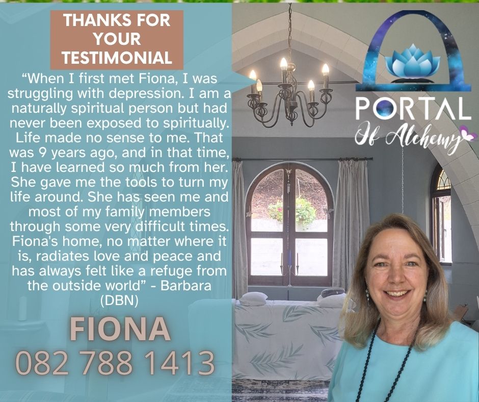 You can experience Fiona’s profound energy healing and guidance in person at her Sacred Healing Space in Pinetown or through a Quantum Session online via Zoom, which is equally powerful and effective.