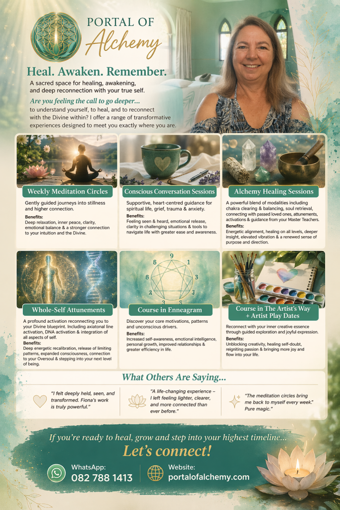 Portal of Alchemy is dedicated to spiritual evolution and self-mastery. Working with the Supreme Creator, Fiona facilitates powerful activations that raise vibrational frequencies, align individuals with the energy of love, and heal the body through light. She helps clients access their spiritual gifts, deepen their connection with the Divine, and align their will with the greater purpose of their soul. Through this sacred work, individuals strengthen their relationship with God, their team of Light Beings, and the divine forces assisting them in their life’s journey and service work.